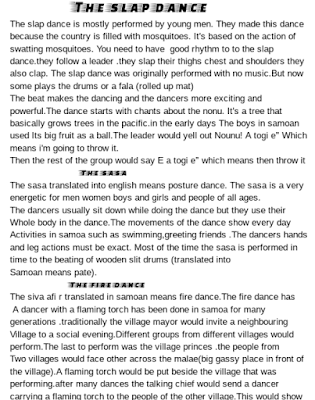 This week my group and I were learning about Samoan dances.first, our teacher (sally) told us to read a book.she let us pick out for a few selections (because of shes cool)The group and I picked Samoan dances.It was filled with heaps of things on Samoan dances.After we read the book the book she told us we could either make a poster brainstorm or write about it. we chose to write about it.